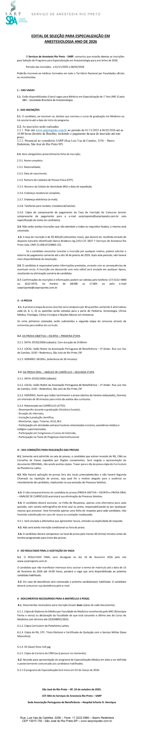 O Serviços de Anestesia Rio Preto - SARP, comunica que estarão abertas as inscrições para Seleção do Programa para Especialização em Anestesiologia para ano letivo de 2026.